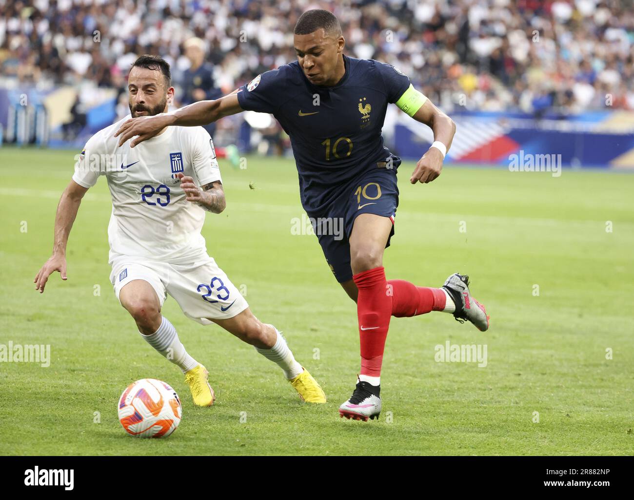 Kylian Mbappe of France, left Manolis Siopis of Greece during the